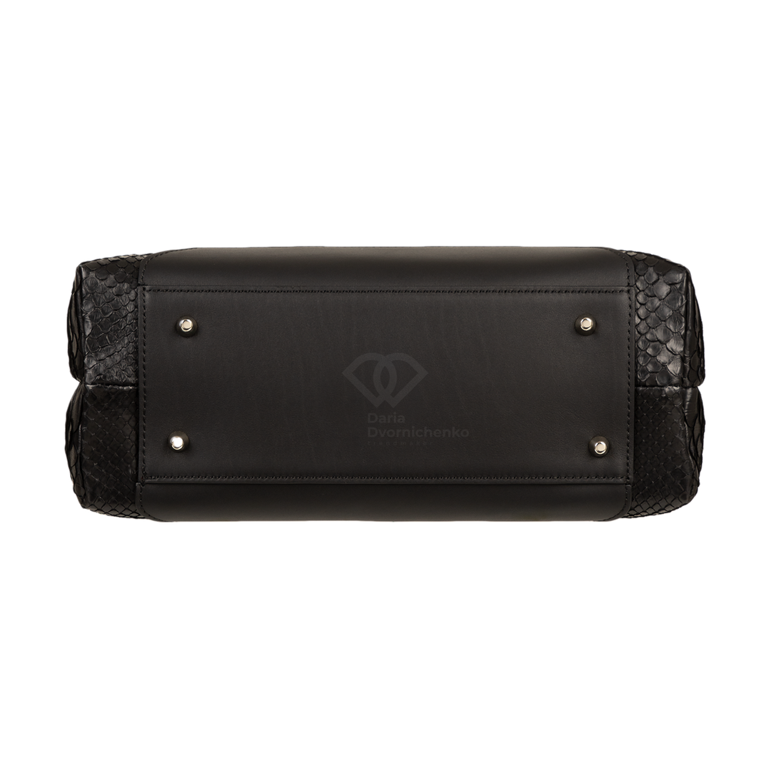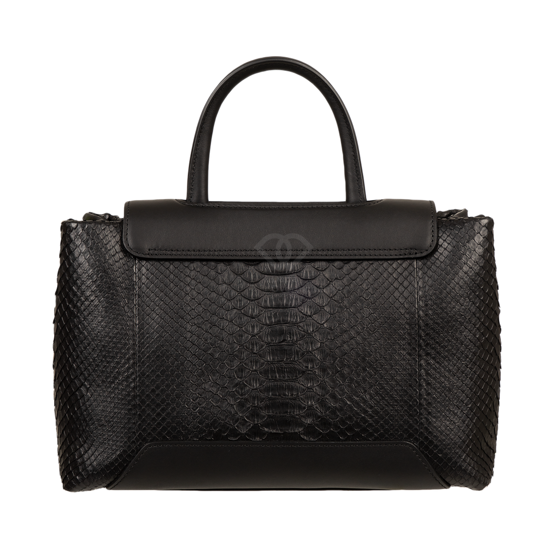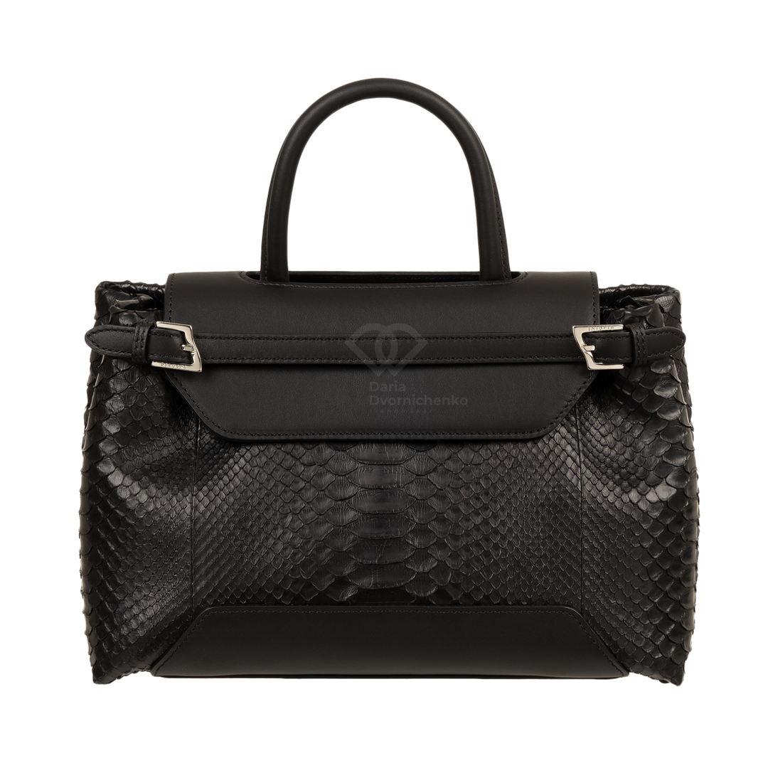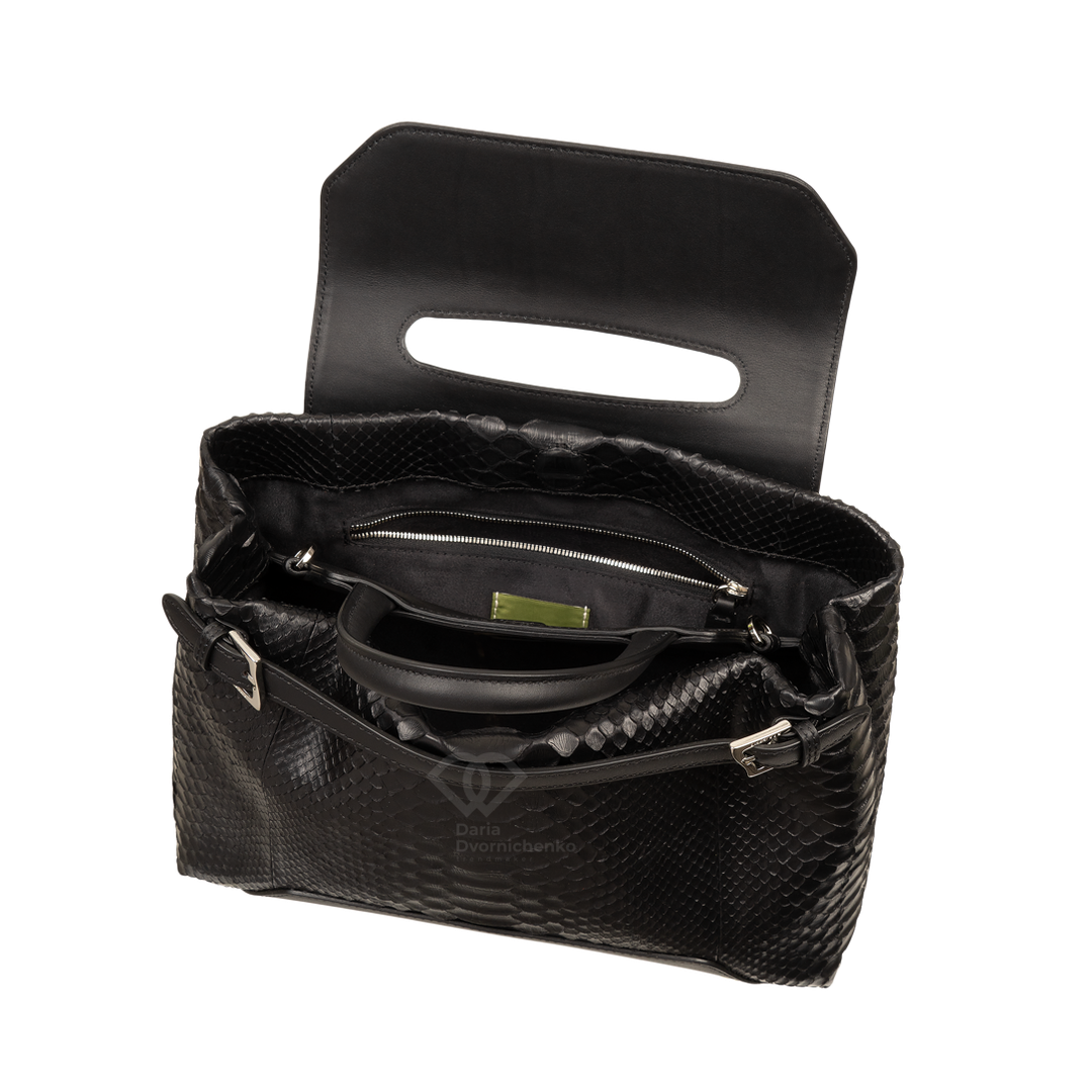 Особенностью модели является комбинирование натуральной кожи питона основного корпуса с вставками из гладкой кожи на клапане и верхней части ручки, что придает изделию роскошный и дорогой вид. Невероятная износостойкость питона с годами выглядит только благороднее. Сумка оснащена удобной верхней ручкой, а также имеет элегантные ремешки с металлическими пряжками по бокам. Клапан закрывается на скрытую магнитную кнопку, обеспечивая легкий доступ и надежное хранение содержимого. Внутри сумка отделана замшевой подкладкой и имеет несколько отделений, включая карманы на молнии для ценных вещей и открытые карманы для мелочей, что обеспечивает прекрасную организацию пространства.