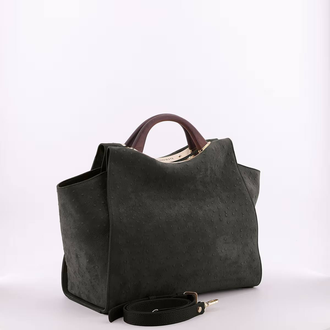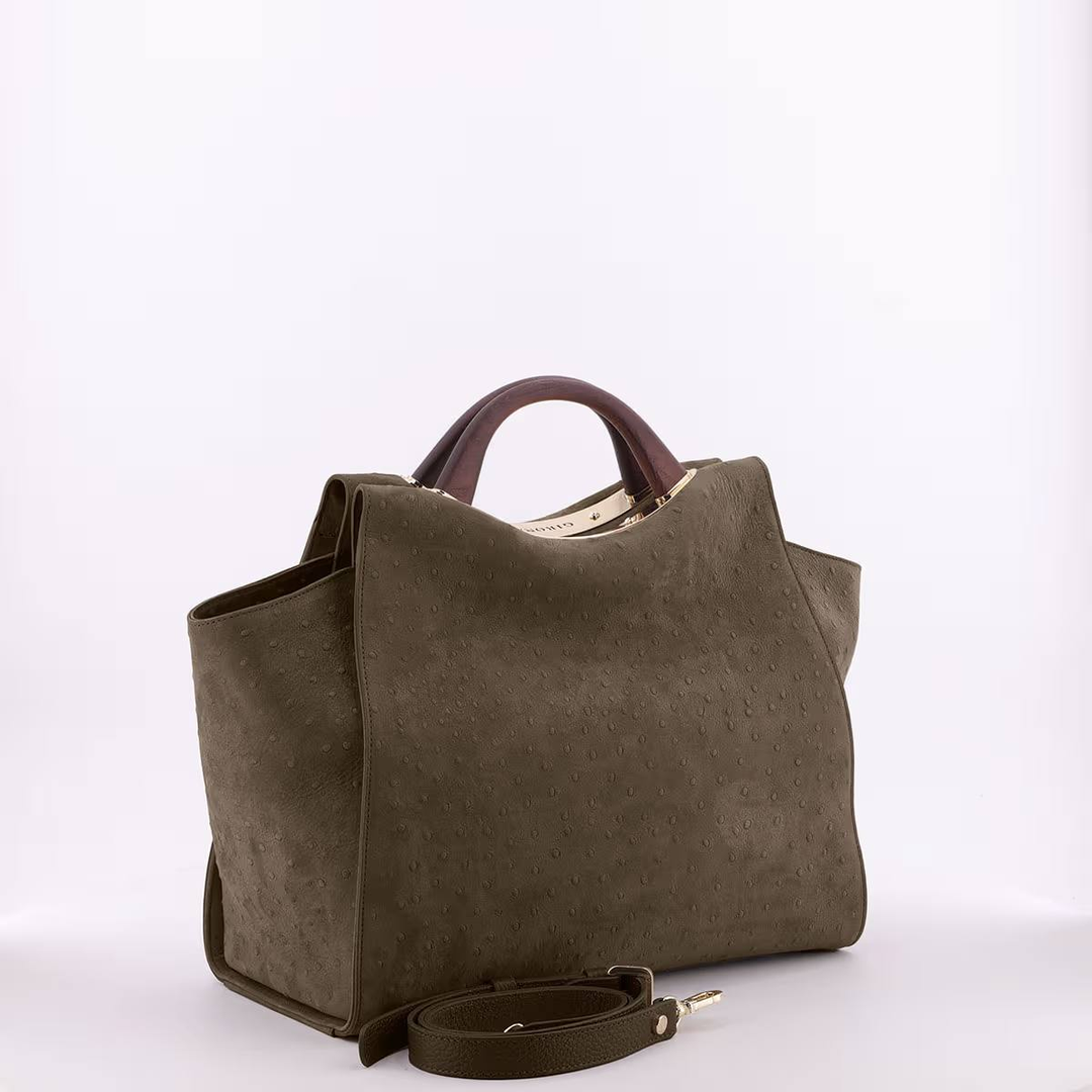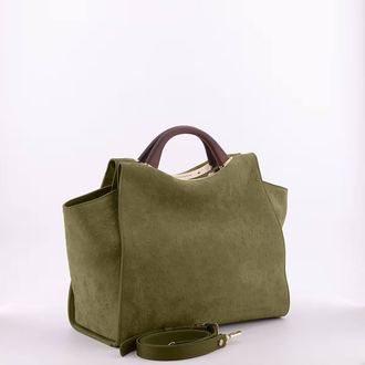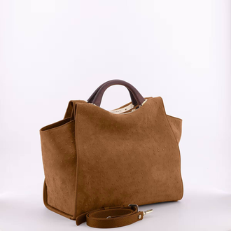 Вместительная модель с четкими линиями и расширяющимися боковыми панелями.Выполнена из высококачественной кожи с характерной фактурой «под страуса»,дополнена изящной золотистой фурнитурой и съемным плечевым ремнем, что позволяет носить её как в руках, так и на плече.