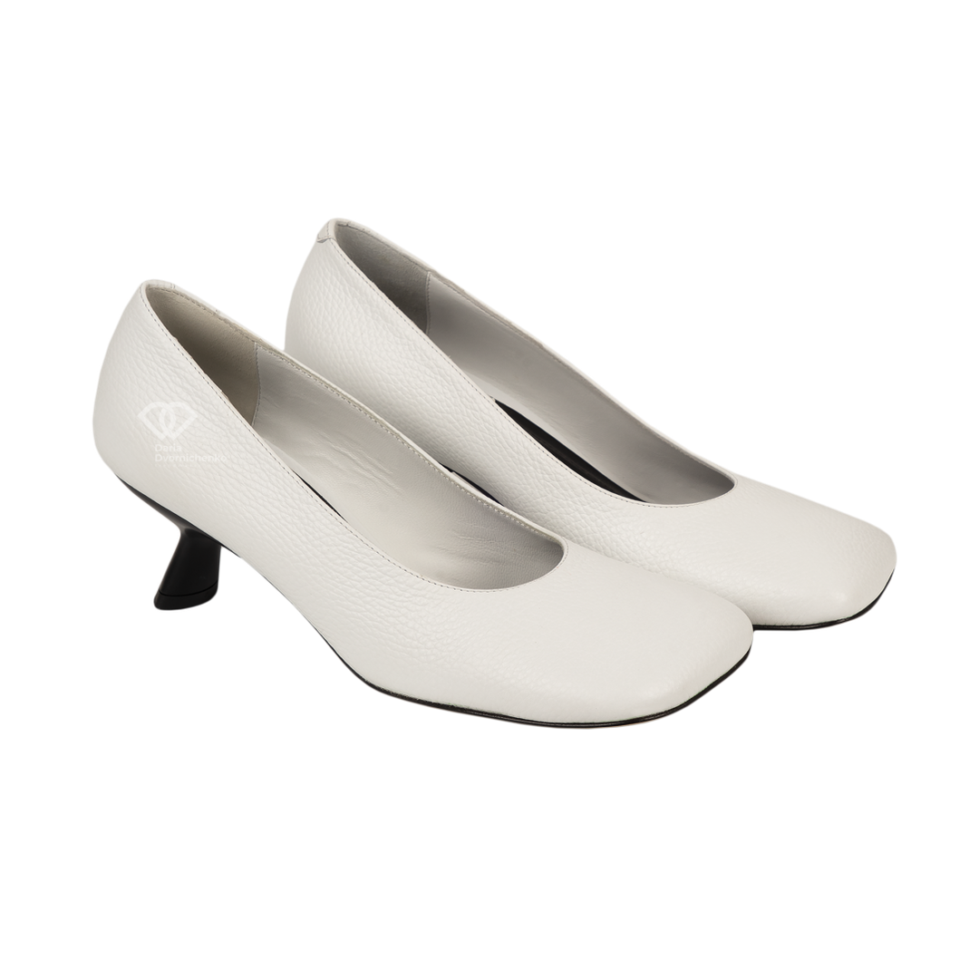 Высококачественная натуральная кожа с выраженной мягкой зернистой фактурой, которая идеально адаптируется к форме стопы. Безупречный молочно-белый верх в контрастном сочетании с черной подошвой и каблуком — беспроигрышная классика. Глубокий вырез визуально удлиняет линию ноги, создавая изящный силуэт. Оригинальный невысокий каблук «рюмочка» (kitten heel) черного цвета обеспечивает устойчивость и добавляет образу графичности.